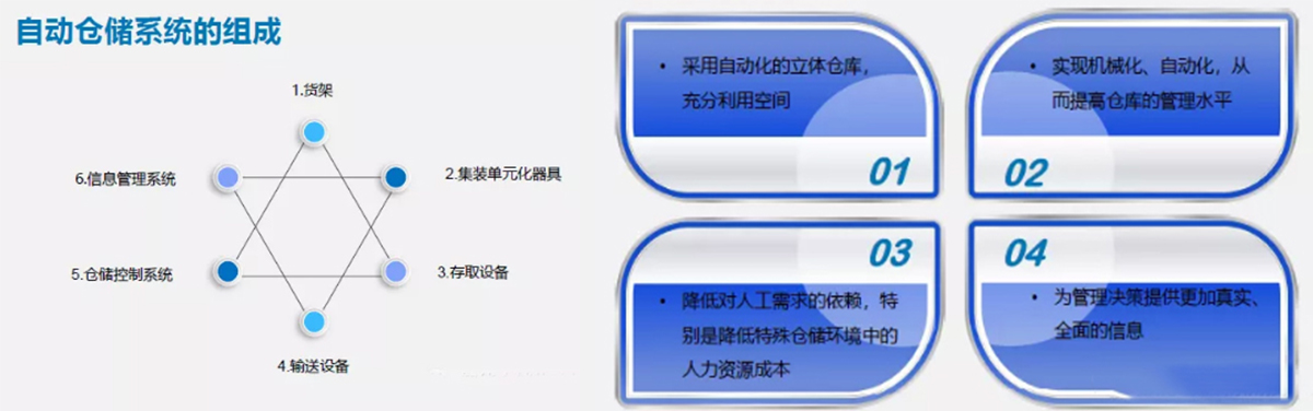自动仓储系统初期多指自动化立体仓库,如今已远远超过了之前的范畴。从广义上来讲自动仓储系统还包括可对单元货物实现自动化装卸车、自动化拆码垛、自动化存取,以及可以实现自动化分拣、自动化包装等功能,并进行自动控制和信息管理的仓储系统。
